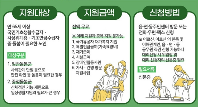 특히 독거노인, 조손가정, 노부부 가구 등 일상생활 수행이 어렵거나 사회적 고립에 놓인 노인을 중심으로 지원이 이루어집니다. 이를 통해 고독사 예방, 자살 위험 감소, 건강 악화 방지 등 다양한 사회적 효과를 기대할 수 있습니다.