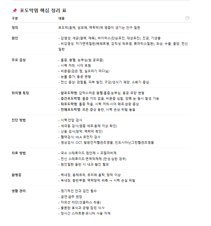 전체포도막염은 포도막 전체에 염증이 생기는 것으로, 앞포도막염과 뒤포도막염의 증상이 모두 나타나며 심각한 시력 저하로 이어질 수 있습니다.