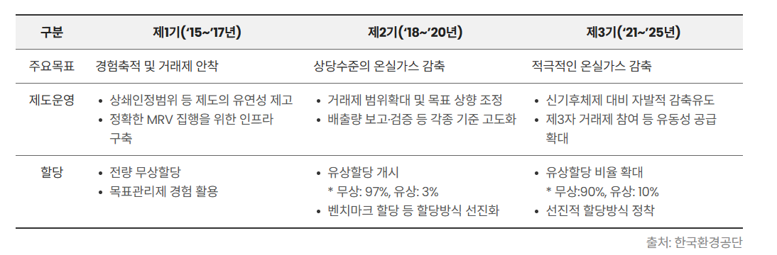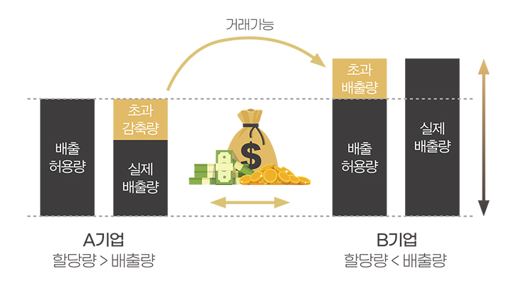 정부가 기업마다 정해주는 온실가스 배출 한도 안에서 활동해야 하며, 이를 초과하면 배출권을 사서 부족분을 메워야 하고, 반대로 남으면 다른 기업에게 팔 수 있는 구조로 되어 있습니다.